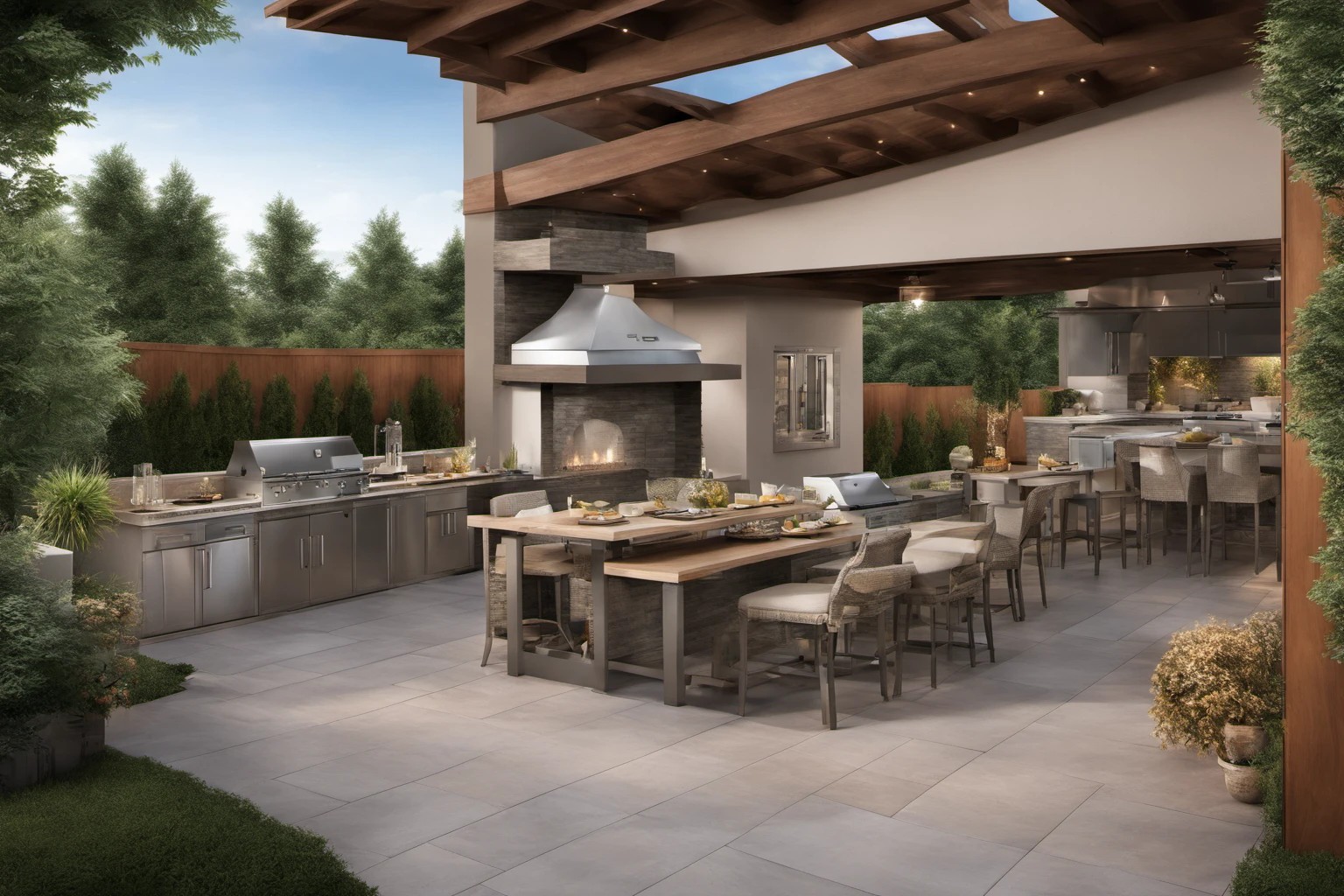 Profesyonel modern bir dış mutfağı temsil eden tasarımda, parlak cihazlar ve ısınmış ahşap tonları kullanılır. Entegre yemek alanına sahip, lüks ev exterior'larında ideal.