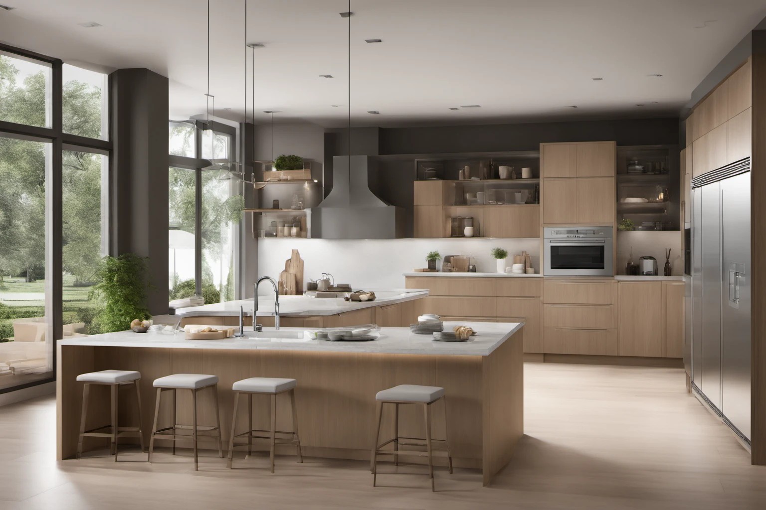 Şeffaflık ve minimalist bir döşeme ile modern mutfak tasvirinde profesyonel fotoğraf. Doğal ışığın süzülmesiyle temiz hatlara vurgu yapılır.
