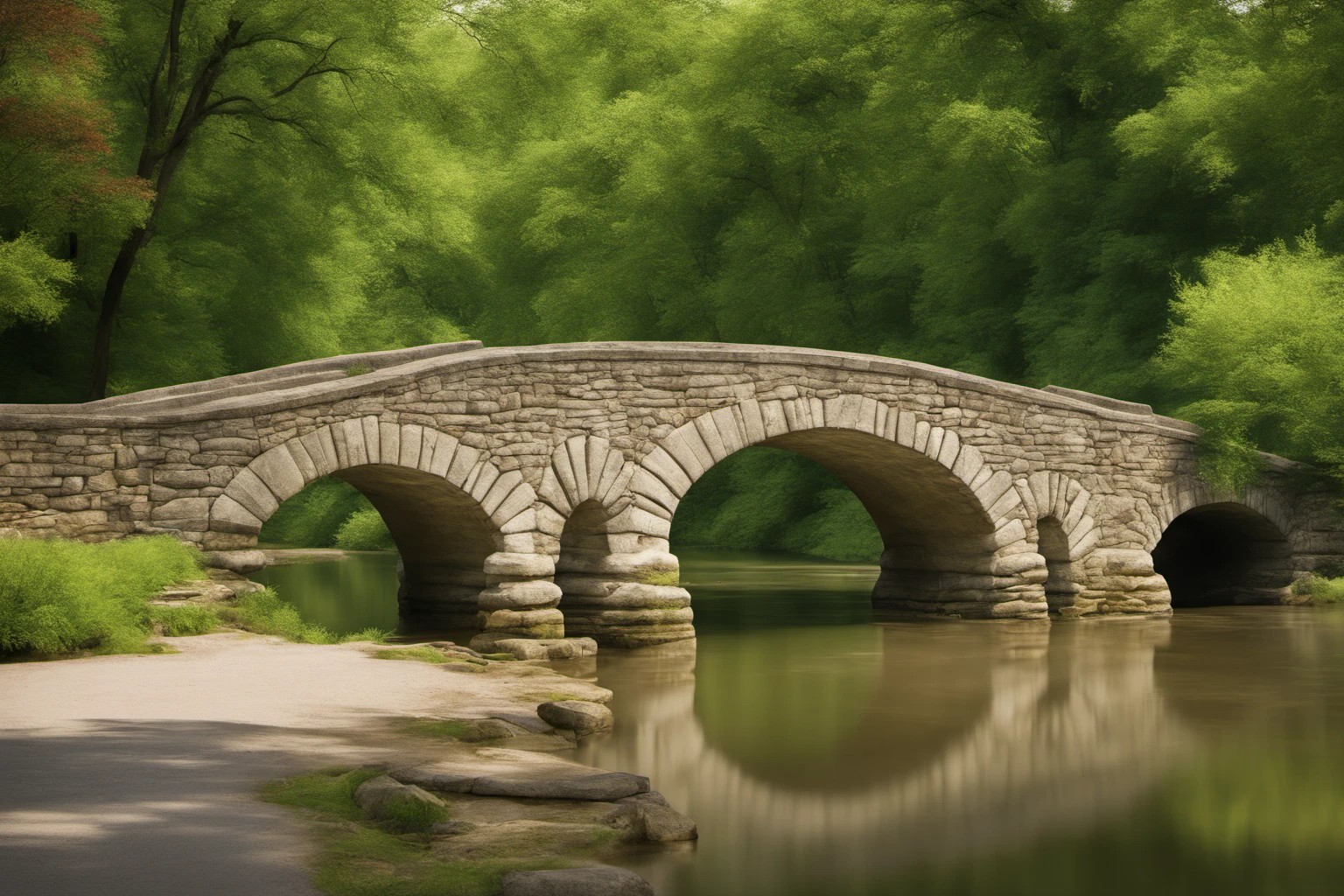 Sessiz bir nehirden geçen eski taş köprü ve çevresindeki doğal güzellikler ile geleneksel mimari. Sabah ışığının serin hali köprünün asil ve detaylı stonework'ını vurguluyor.