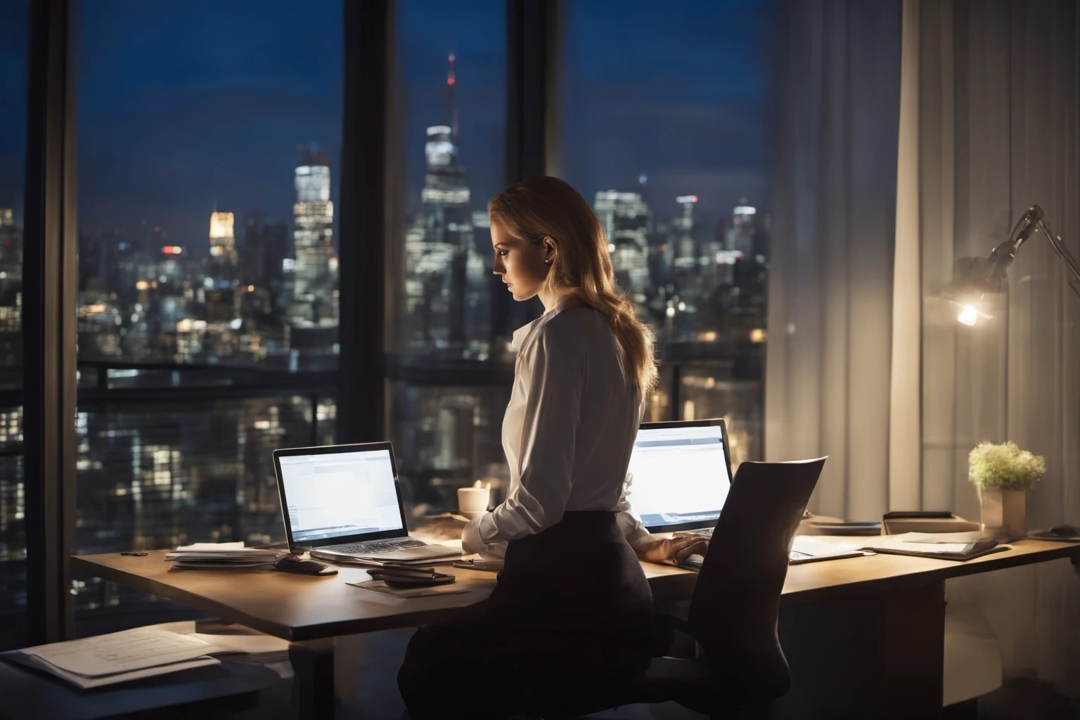 Yetenekli İş Kadını Gece Çalışıyor – Profesyonel Masalar Setupu