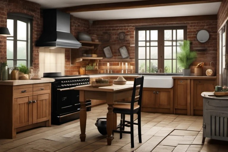Góc bếp ấm áp với gam màu gỗ sần, giấy dán tường hoa và đồ dùng cổ điển. Sử dụng: trang sản phẩm thương mại điện tử, bài viết blog, tạp chí nội thất.
