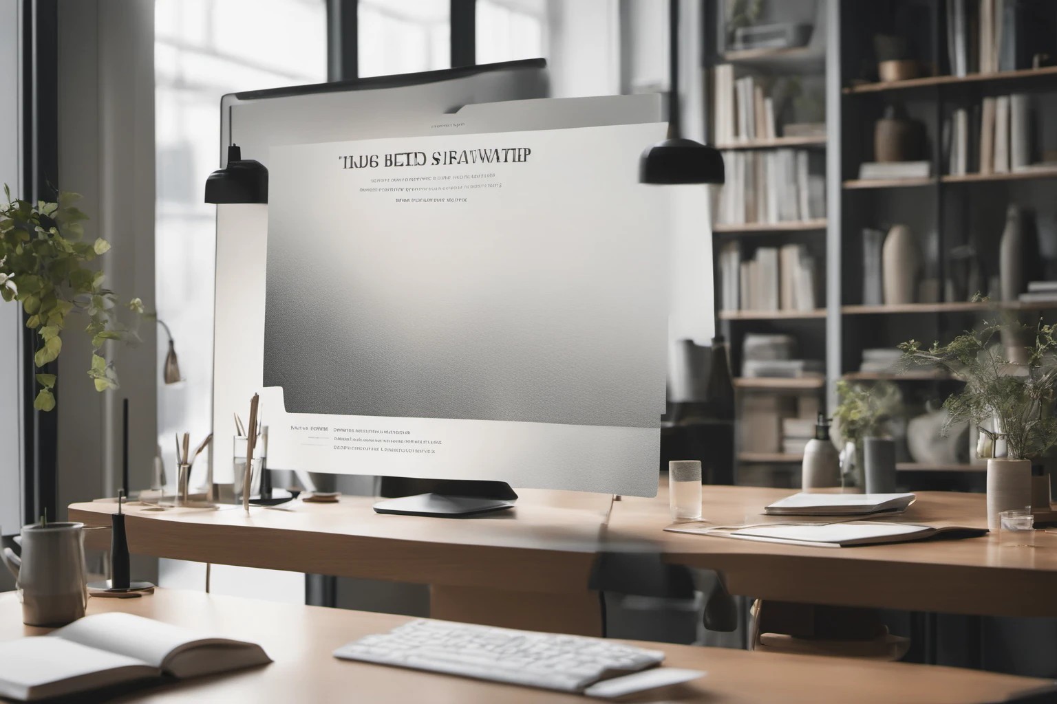 Hình ảnh chuyên nghiệp thể hiện không gian làm việc tối giản với đồ dùng văn phòng tinh tế và cây xanh trong ánh sáng tự nhiên nhẹ nhàng. Sử dụng cho trang sản phẩm e-commerce, hồ sơ portfolio thiết kế nội thất và banner marketing.